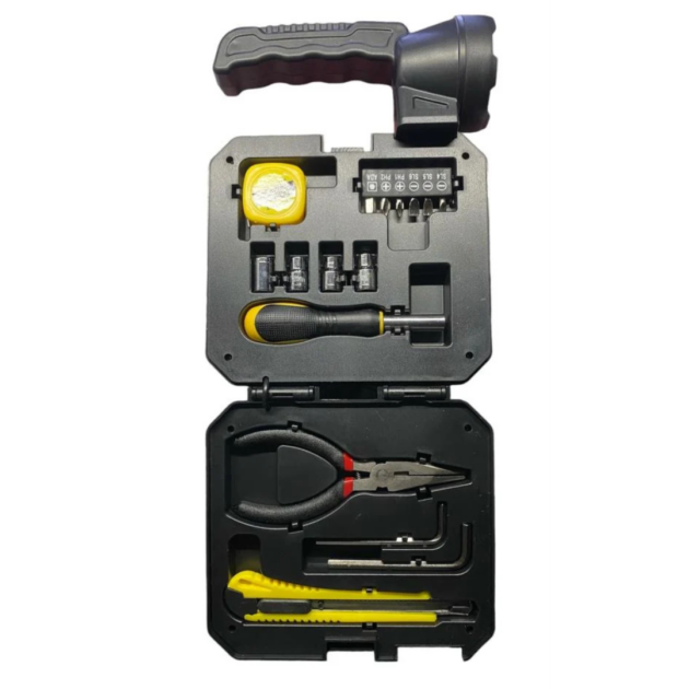 | محتويات الصندوق | كماشة، مفكات، شريط قياس، مفاتيح، أدوات قطع |
