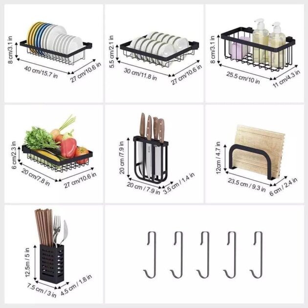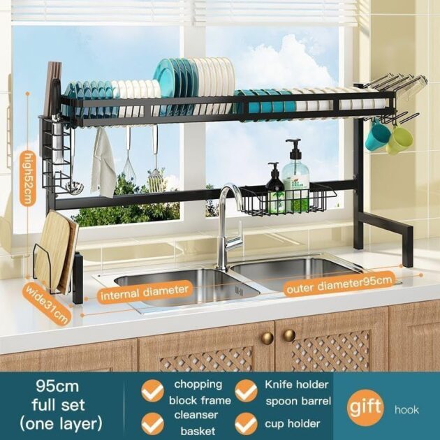 تصميم متعدد الوظائف (All-in-One): يحتوي على أماكن مخصصة لكل شيء؛ رف للأطباق، رف للأوعية والأكواب، حامل خاص للسكاكين، سلة للملاعق والشوك، وحامل جانبي لبلانشة التقطيع.